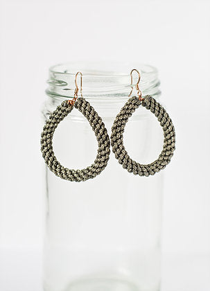 Each earring is hand crafted from rose gold plated metal and string purchased from our local merchant. The loop measures 3.5cm in diameter. Available in olive, teal, black, mustard and green.