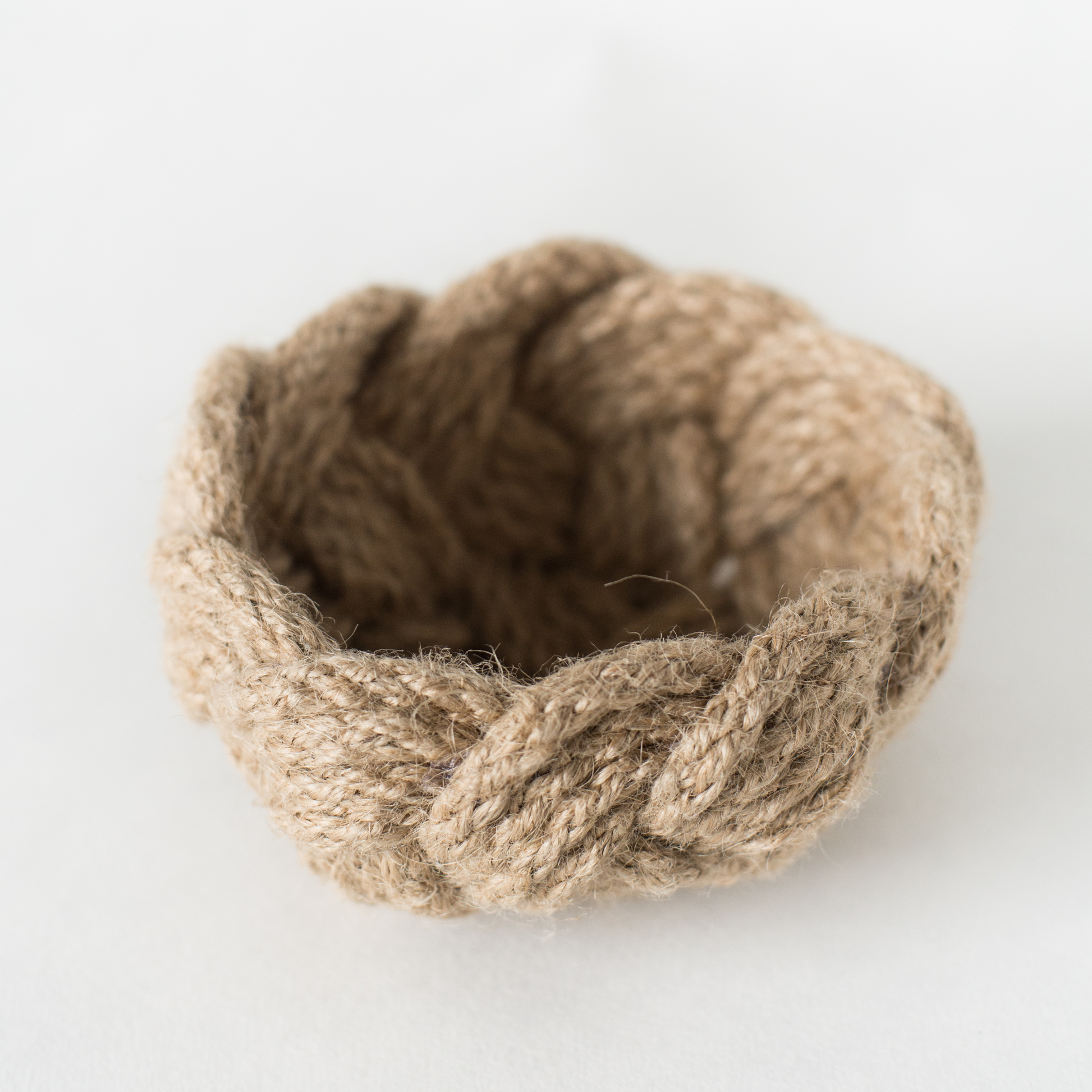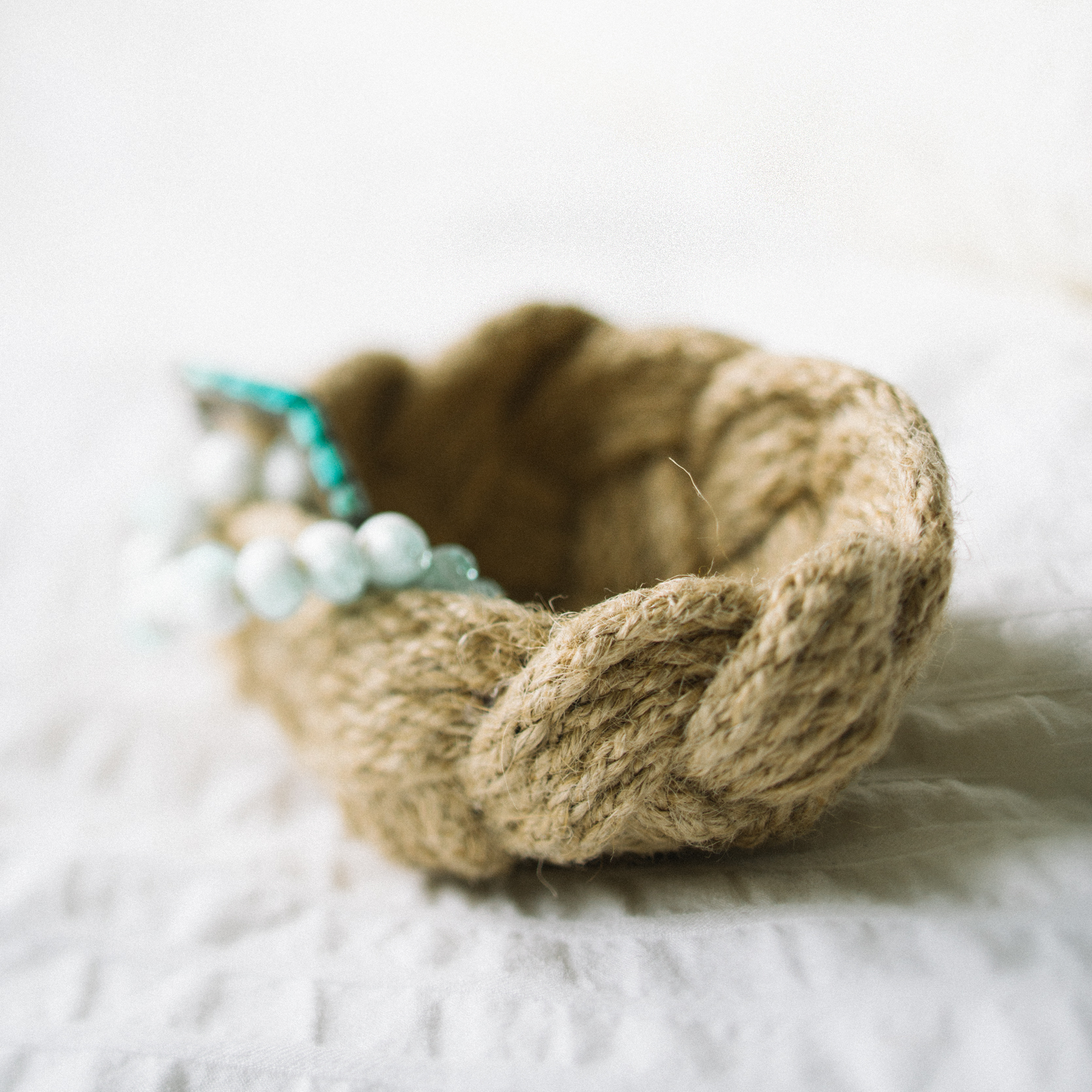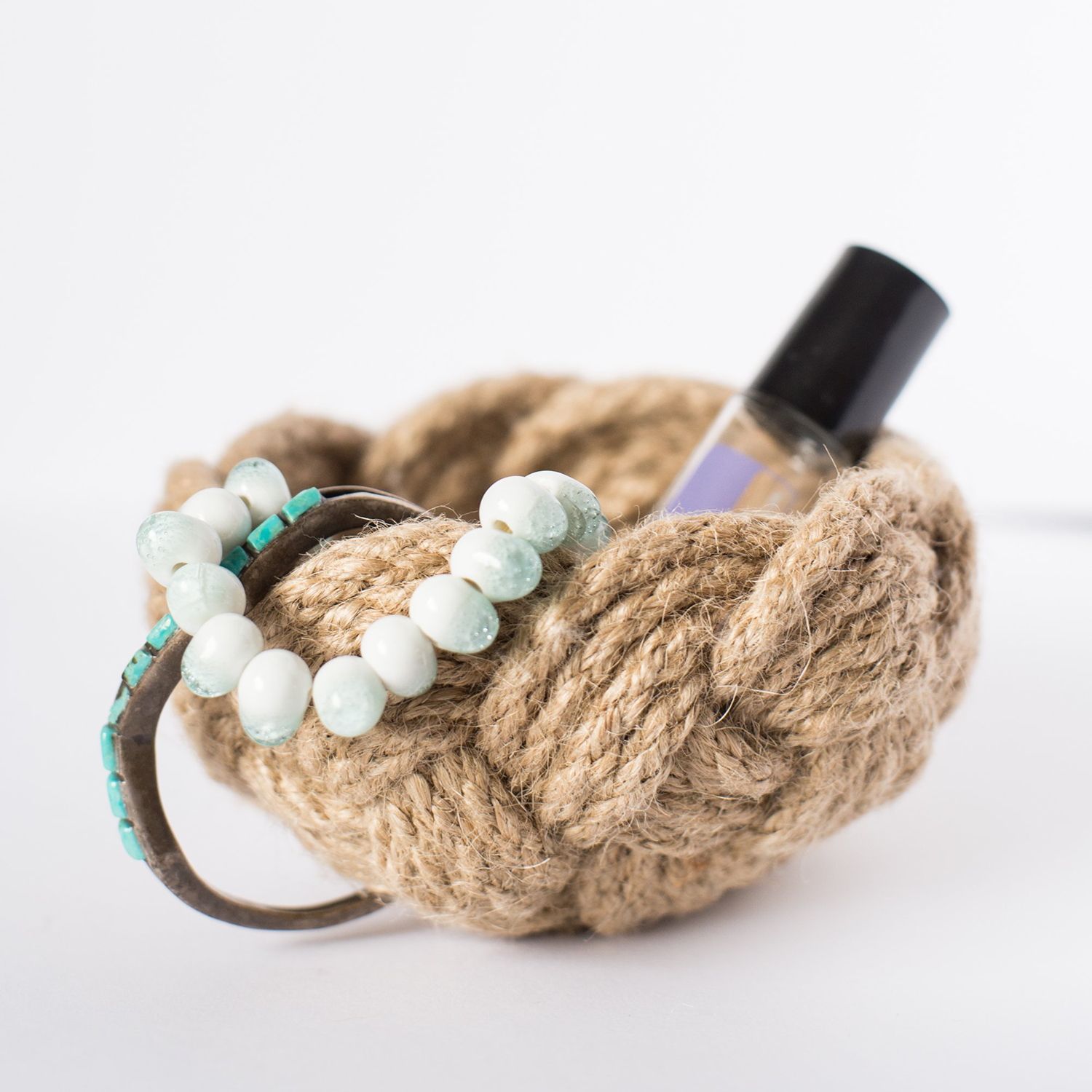 This small knotted bowl is truly one of a kind. Measuring approximately 4" wide by 2.5" tall, it is perfect as a small jewelry or change dish. Each bowl is handmade by a single strand of new 8mm rope.
