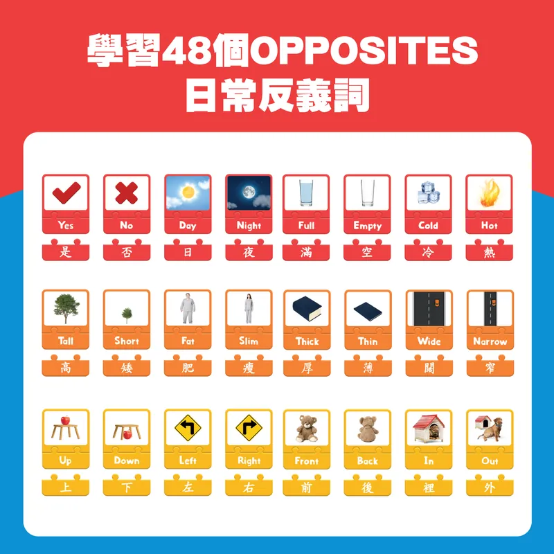 通过逼真的图像,年轻的学习者可以掌握 48 对反义词,从而以有意义的方式提高识别和记忆能力。
